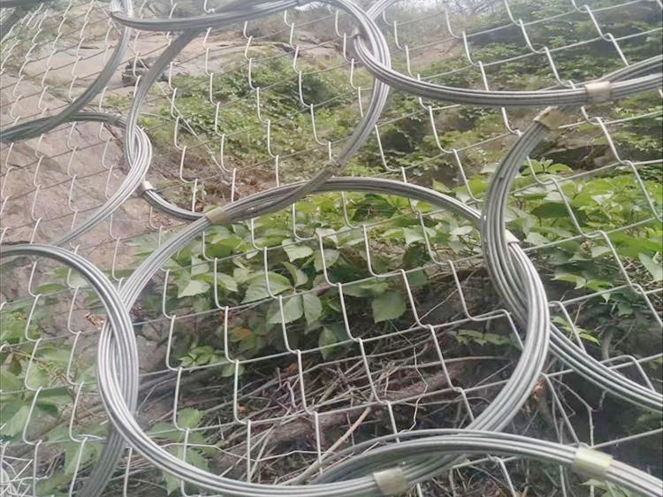 环形被动防护网又称为ROCCO环形网,是由数股钢丝盘结成环形相互套接而形成的被动拦石网,采用热镀锌工艺。在落石冲击过程中能发生自身几何形态改变,具有更为突出的柔性特征,能够实现高3000kJ以上动能的落石阻拦。并且能进一步简化结构形式(如支撑绳和减压环的配置),方便局部受损后的维护修复,ROCCO环形网已经成为一种替代钢丝绳网系统的新型拦石网(RXI型),实现了SNS被动防护系统的更新换代和升级。