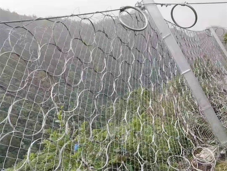 环形被动防护网又称为ROCCO环形网,是由数股钢丝盘结成环形相互套接而形成的被动拦石网,采用热镀锌工艺。在落石冲击过程中能发生自身几何形态改变,具有更为突出的柔性特征,能够实现高3000kJ以上动能的落石阻拦。并且能进一步简化结构形式(如支撑绳和减压环的配置),方便局部受损后的维护修复,ROCCO环形网已经成为一种替代钢丝绳网系统的新型拦石网(RXI型),实现了SNS被动防护系统的更新换代和升级。